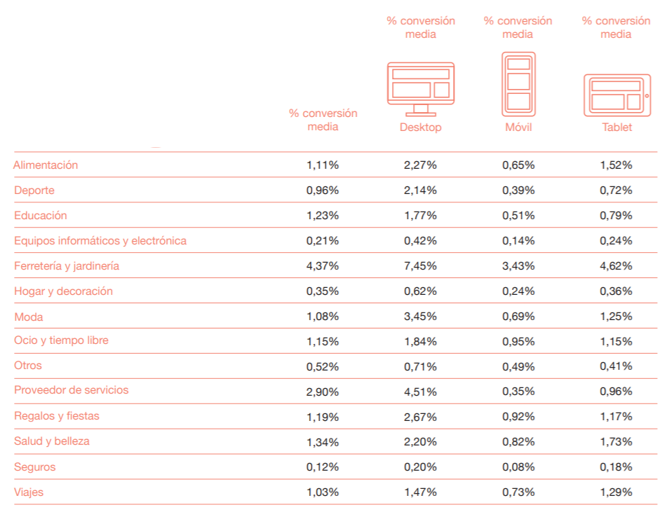 Uno de los mayores retos a la hora de analizar la tasa de conversión es encontrar un dato de referencia sobre los que comparar el rendimiento de nuestro negocio. Este valor de referencia va a depender de muchos factores, como el sector al que pertenezcamos o del producto que vendamos, pero de promedio podemos decir que la tasa de conversión media de un ecommerce en España está entre el 1% y el 3%.