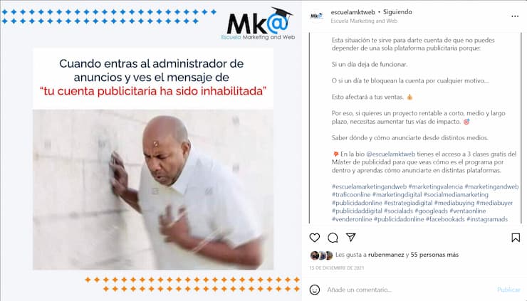 Esta publicación es de la Escuela Marketing and Web, y me ha parecido interesante ponerla como ejemplo porque los memes son un tipo de contenido que funciona muy bien en Instagram.