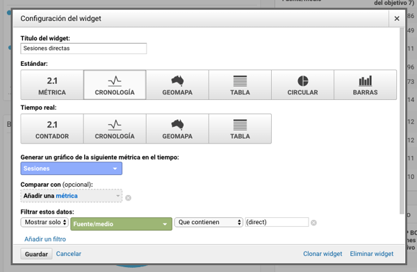 - Sesiones directas: es un widget de tipo “Cronología” en el que se muestra la métrica “Sesiones” filtrada en base a la dimensión “Fuente/Medio” para visualizar únicamente la que está marcada como "direct". El objetivo de este gráfico es mostrar el crecimiento en el tráfico que entra de forma directa en la página.