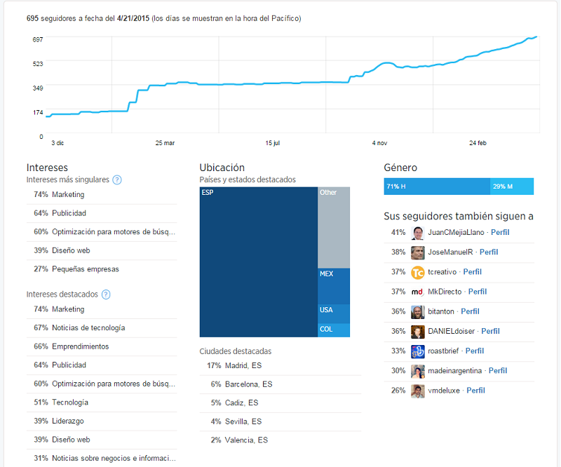 ¿Y para qué nos sirve esto? En primer lugar, para ver si estamos haciendo las cosas bien. Dentro de los intereses, deberíamos ver como los mayores porcentajes corresponden a nuestra temática. Si hablamos de diseño web y ese interés no aparece en esta lista, estaremos haciendo algo mal, ¿verdad?