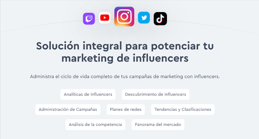 Este software está diseñado para poder descubrir influencers tanto en Instagram como en otras herramientas (YouTube, Twitter, Twitch), verificar la autenticidad de sus cuentas y trackear los resultados obtenidos por sus campañas de marketing de influencers.