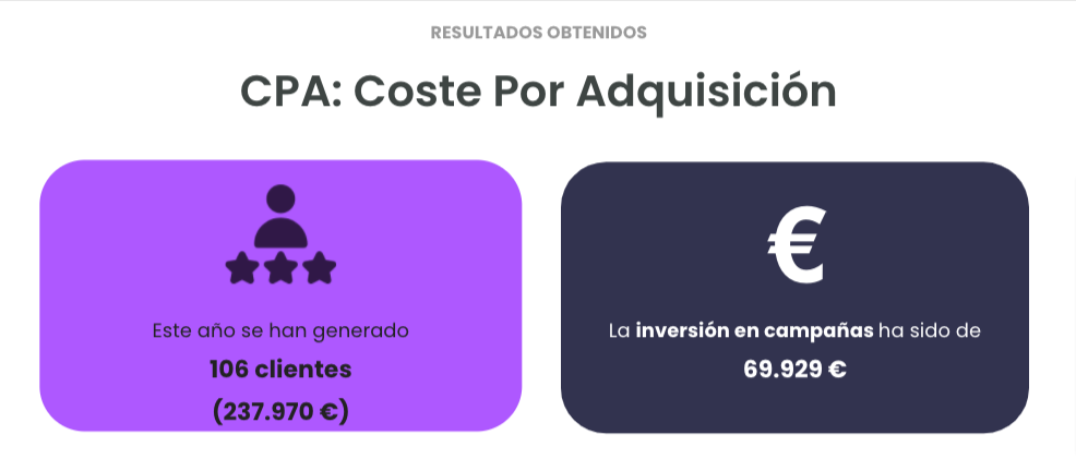 Vamos a verlo con un ejemplo real de uno de nuestros clientes. En este caso, no se trata de una campaña a corto plazo. No obstante, tal y como hemos comentado, aunque el CPA suele ser un modelo que se utiliza para campañas breves, también se puede saber el coste de un proyecto anual si tenemos clara la inversión en publicidad y los clientes obtenidos: