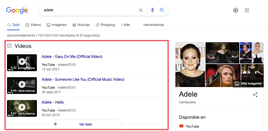 Desde que Google compró YouTube integró todos los resultados de vídeo en el buscador. Por lo tanto, ahora pueden aparecer videos en vez de resultados de texto para ciertas búsquedas que enlazan directamente con YouTube.