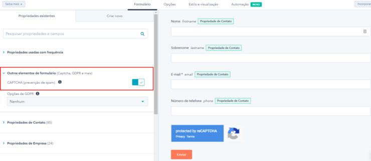 Se o seu CMS é da HubSpot, fique tranquilo, pois os formulários que acompanham a HubSpot contam com um sistema de validação ao inserir endereços de e-mail. Além disso, é possível adicionar proteção adicional por meio de captchas graças ao seu sistema tradicional de verificação para evitar spam. É muito mais fácil do que inserir com o Google recaptcha.